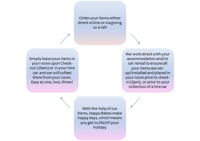 Our process is simple. No Paperwork, No Security Deposits, No Cancellation Fees, No hassles. Simply order your products either online or by giving us a call or email. We work with all the car rental companies across Cairns. We work with all the accommodation providers, both resorts directly and externally agent managed holiday accommodation venues in Cairns, Trinity Beach, Palm Cove and Port Douglas. Once we have your requested items, dates and booking names we work with the agent to ensure we have access to your room/house/rental car prior to check-in. The same applies on check-out, we collect your items after your departure. We also aim to have items delivered to your accommodation prior to the 2pm check-in times. When your room is accessible when we arrive to deliver your baby hire items we will even have the items ready and waiting in your room prior to your arrival. We then arrange the collection from your room after you check out. With our service you don’t need to worry about trying to move your baby hire items in or out of your room, we do this for you.